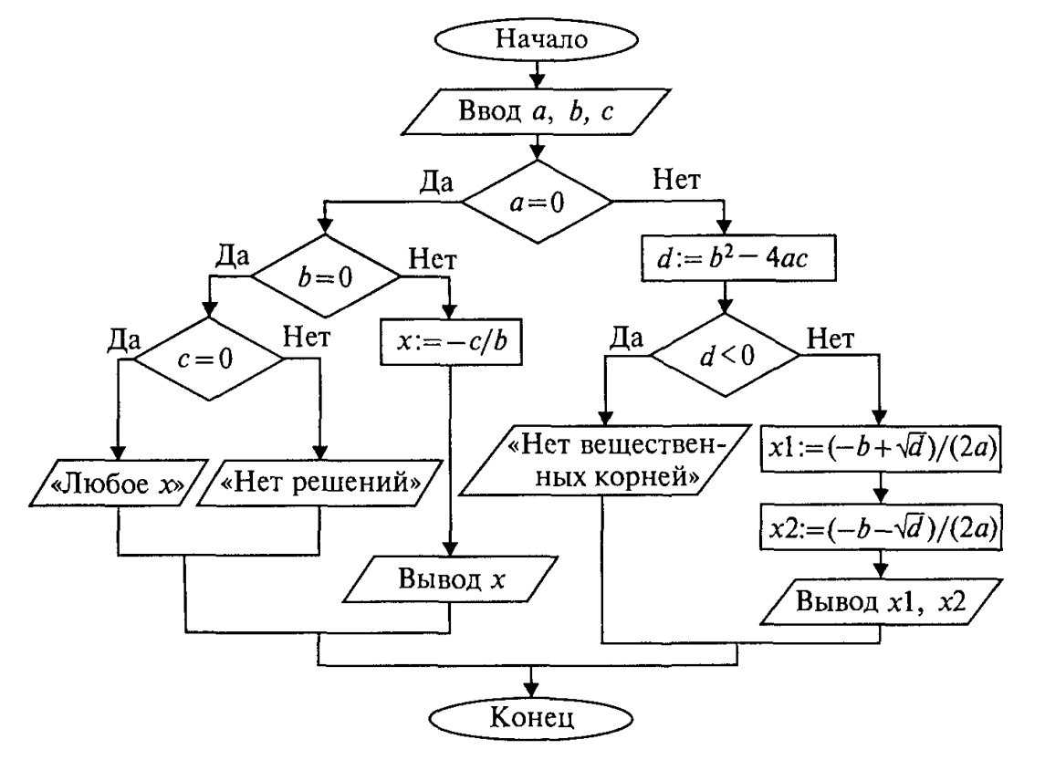 Составим алгоритм решения квадратного уравнения: ax2+bx+c=0