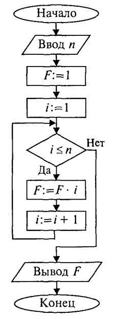 Ниже приведена блок-схема алгоритма. В нем используются три переменные целого типа: n — аргумент; i — промежуточная переменная; F — результат. Для проверки правильности алгоритма построена трассировочная таблица. В такой таблице для конкретных значений исходных данных по шагам прослеживается изменение переменных, входящих в алгоритм. Данная таблица составлена для случая п = 3.
