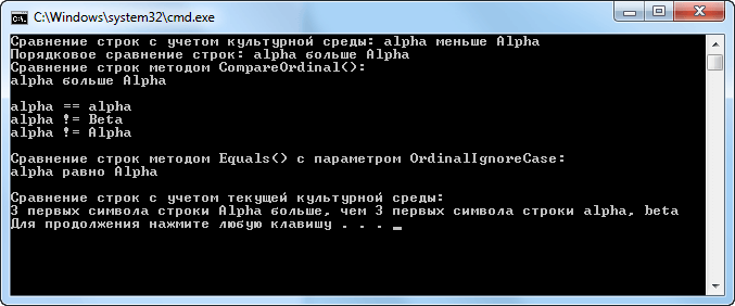 Как станет ясно дальше, во многих видах сравнения символьных строк используются сведения о культурной среде. Но это не относится к операторам == и !=. Ведь они просто сравнивают порядковые значения символов в строках. (Иными словами, они сравнивают двоичные значения символов, не видоизмененные нормами культурной среды, т.е. региональными стандартами.) Следовательно, эти операторы выполняют сравнение строк без учета регистра и настроек культурной среды.