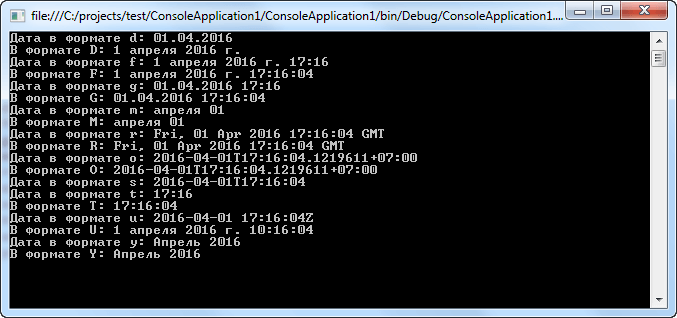 Форматирование даты и времени осуществляется с помощью спецификаторов формата. Конкретное представление даты и времени может отличаться в силу региональных и языковых особенностей и поэтому зависит от настройки параметров культурной среды. Спецификаторы формата даты и времени сведены в следующей таблице:
