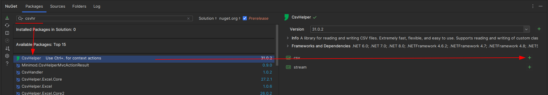 В закладке Packages в строке поиска введите CsvHelper и добавьте найденный пакет в свой проект.