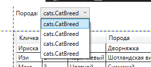 Теперь, имея список пород, добавляем в разметку (файл .xaml) выпадающий список для выбор породы (во WrapPanel):