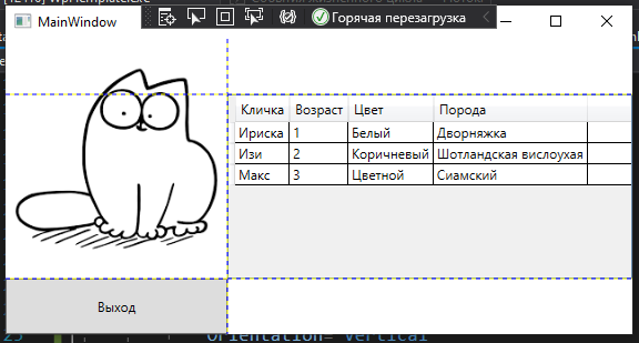 Теперь, имея данные для отображения, мы можем разместить в разметке элемент DataGrid и "привязать" к нему данные: