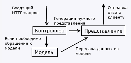 +- __Контроллер__ (controller): представляет центральный компонент MVC, который обеспечивает связь между пользователем и приложением, представлением и хранилищем данных. Он содержит логику обработки запроса пользователя. Контроллер получает вводимые пользователем данные и обрабатывает их. И в зависимости от результатов обработки отправляет пользователю определенный вывод, например, в виде представления, наполненного данными моделей.