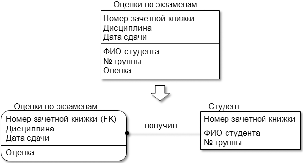 Например, таблица «Оценки по экзаменам» характеризуется следующим набором атрибутов {Номер зачетной книжки, Дисциплина, Дата сдачи, ФИО студента, № группы, Оценка}. Очевидно, что первичным ключом является набор {Номер зачетной книжки, Дисциплина, Дата сдачи}. Полной функциональной зависимостью обладает только один неключевой атрибут «Оценка». Атрибуты «ФИО студента» и «№ группы» могут быть однозначно определены по части первичного ключа – «Номер зачетной книжки». Таким образом, требуется разбиение исходной таблицы на две.