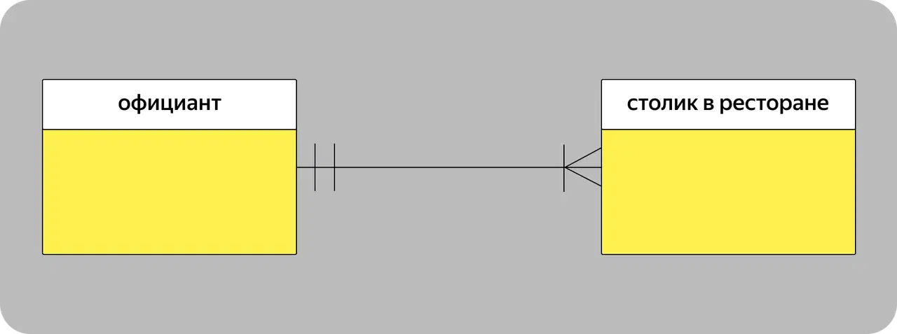 • Один-к-одному — один экземпляр сущности связан только с одним экземпляром другой сущности. Например, пассажир рейса и его место в самолете.
