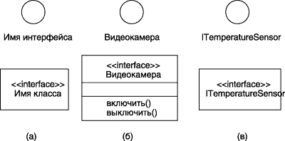 На диаграмме классов интерфейс изображается в виде маленького круга, рядом с которым записывается его имя. В качестве имени может использоваться существительное, которое характеризует соответствующую информацию или сервис, например, " Датчик температуры ", " Форма ввода ", " Сирена ", " Видеокамера ". С учетом языка реализации модели имя интерфейса, как и имена других классов, рекомендуется записывать на английском и начинать с заглавной буквы I, например, ITemperatureSensor, IsecureInformation.