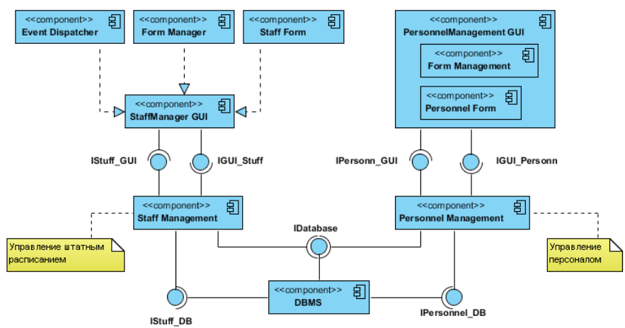 Диаграмма компонентов (component diagram) отображает иерархию подсистем, структурных компонентов и зависимостей между ними. Физическими компонентами выступают базы данных, исполняемые файлы, приложения, библиотеки, интерфейсы ИС и т.д. В случае использования диаграммы компонентов для отображения внутренней структуры компонентов, интерфейсы составного компонента делегируются в определенные интерфейсы внутренних компонентов.