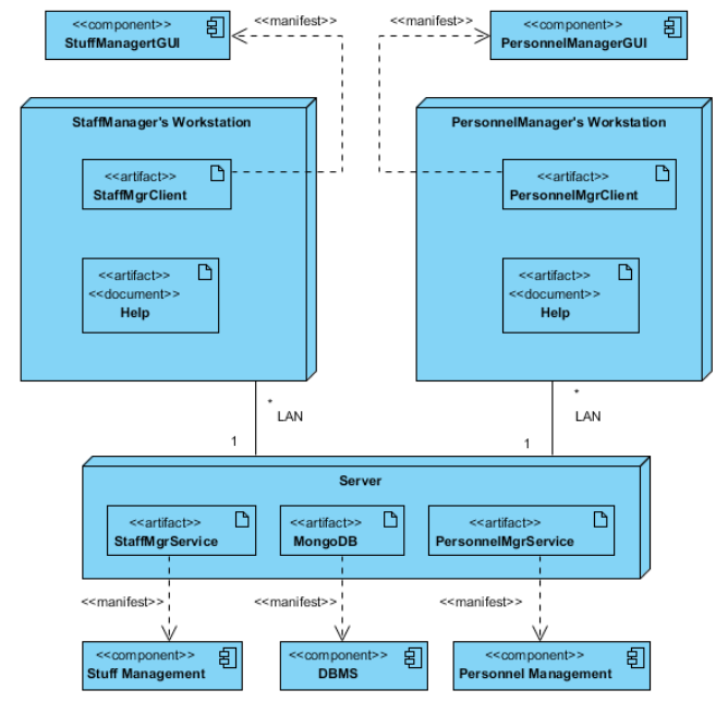 С помощью диаграммы развертывания моделируют физическое распределение различных программных, информационных, аппаратных компонентов системы по комплексу технических средств. Особое внимание на диаграмме развертывания уделяется отображению того, какие используются аппаратные компоненты («узлы» - серверы баз данных и приложений, веб-верверы), какие программные компоненты («артефакты» - базы данных, веб-приложения) работают на каждом из них и как части комплекса соединены друг с другом.