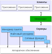 Клиент-серверная архитектура ОС основана на минимизации количества функций, выполняемых ядром (точнее, микроядром) такой системы. Например, на уровне ядра выполняются только планировщик, примитивы синхронизации и служба сообщений. Вся остальная функциональность выносится на пользовательский уровень и реализуется через серверы. Приложения-клиенты обращаются к ним и получают от них ответы путем обмена сообщениям через службу сообщений уровня ядра.
