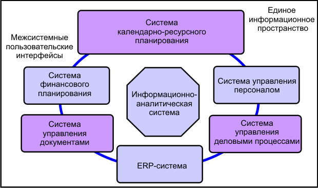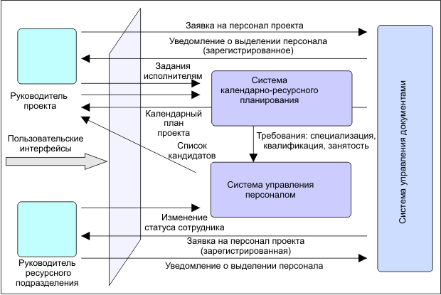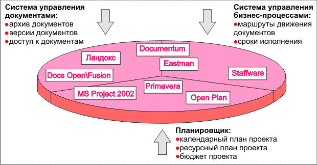 В контур управления проектом могут вовлекаться кроме системы календарно-ресурсного планирования (которая традиционно рассматривается как основа автоматизации управления проектами) еще и целый ряд других информационных систем, эксплуатирующихся на предприятии, которые могли бы использоваться при решении тех или иных задач управления проектом, - от статистических пакетов до систем финансового планирования и ERP-систем.