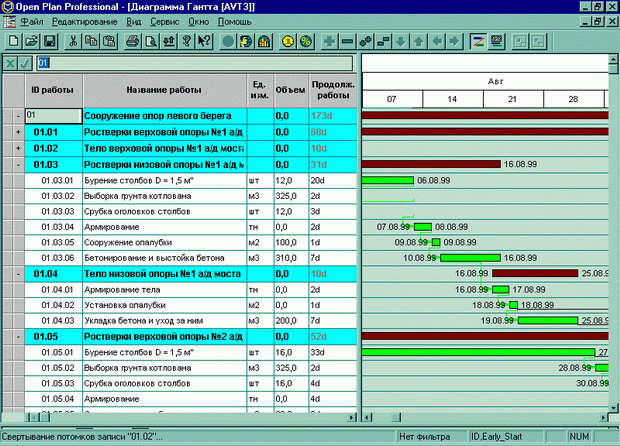 Рис. 7.7. Диаграмма Гантта с разбиением списка работ на группы по кодам в Оpen Plan