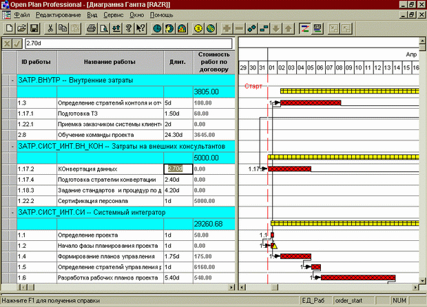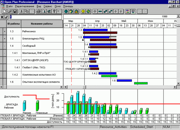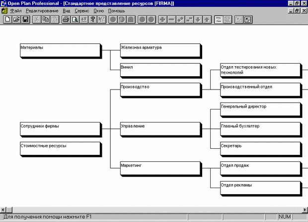 Кроме того, в Оpen Plan предусмотрена возможность создания иерархической структуры ресурсов (исполнителей, оборудования, материалов, затрат), что позволяет выбирать степень детализации при просмотре загрузки ресурсов, проводить планирование и назначение ресурсов на суммарном уровне.