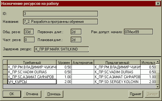 Менеджер принимает решение о том, устраивает ли его предложенный системой ресурс - нажатие кнопки Принят, при которой квалификация переходит в графу Альтернативный, а предлагаемый ресурс в Требуемый, то есть при новом запуске процедуры ресурсного планирования, если предлагаемый ресурс К_ПР.SD.SERGEY KOLCHIN окажется задействованным на других работах, будет учитываться, что можно предложить на работу другого исполнителя, обладающего данной квалификацией.