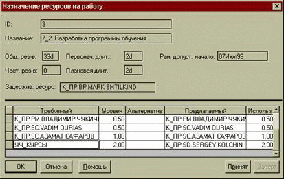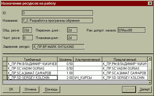 Менеджер может зафиксировать предложенный вариант назначения - "окончательно и бесповоротно" назначить исполнителя на работу (нажатие кнопки Заперт переводит предлагаемый ресурс в Требуемый, однако колонка Альтернативный остается пустой).