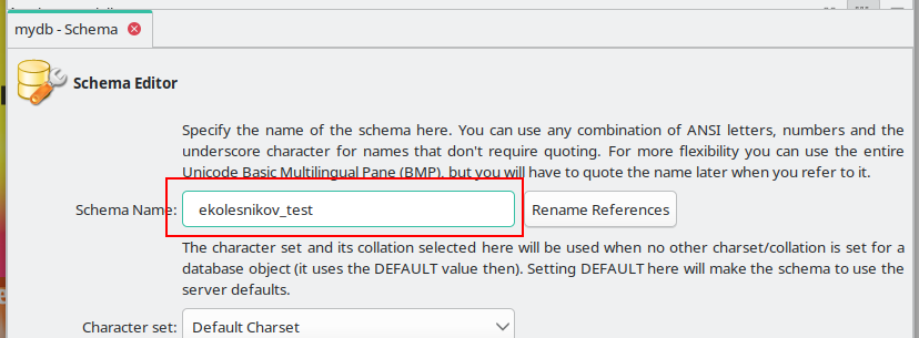Переименуйте модель. Название модели будет использоваться в DDL-скрипте как название базы данных, поэтому название должно соответствовать задаче: например, ekolesnikov_test для лабораторных работ и user01 при выполнени демо-экзамена (если у вас еще нет аккаунта для подключения к БД, то можете этот шаг пропустить).