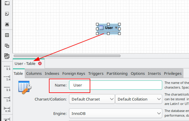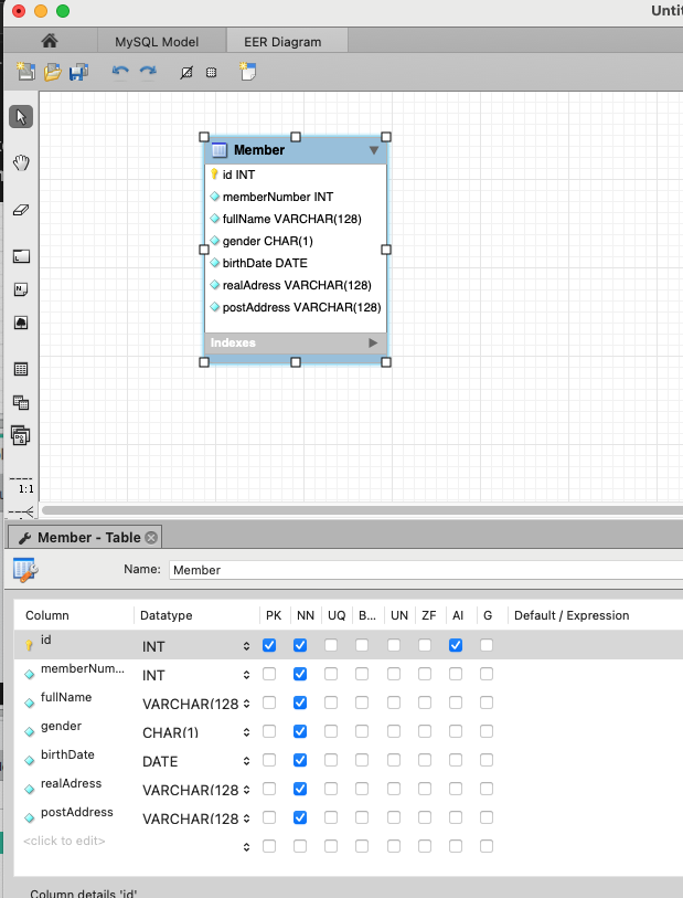 Двойным кликом по таблице можно открыть окно свойств, где задать название таблицы (Member), добавить поля и их свойства