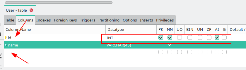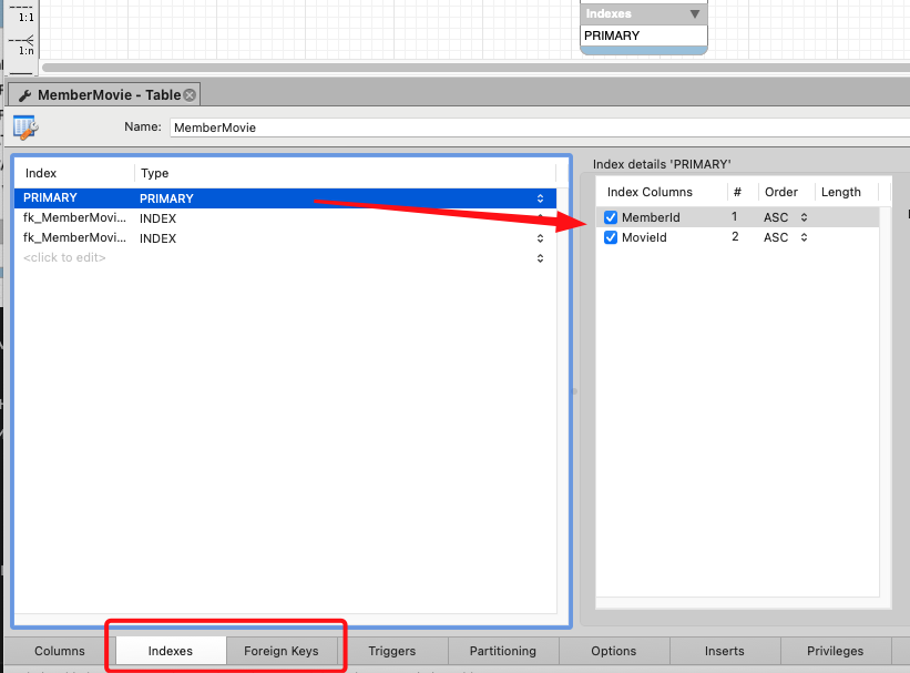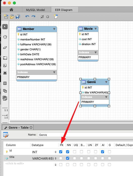 Обратите внимание на типы ключей в таблице связи (MySQL Workbench использует не буквенное обозначение, а символьное: первичный ключ помечается ключиком, а внешний - оранжевым ромбиком). Для таблицы связи оба поля входят в первичный ключ (составной ключ)