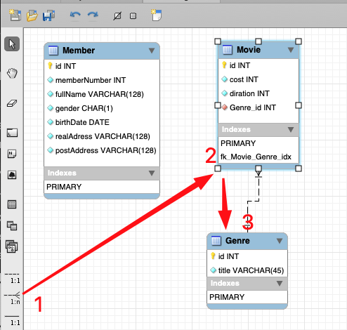 Связь один-ко-многим между сущностями Фильмы и Жанры (проговариваем для себя: у фильма может быть один жанр, один и тот же жанр может быть у нескольких фильмов)