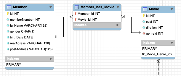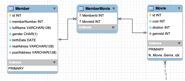 Из приведенного выше сценария мы можем видеть, что нужно использовать отношение «многие ко многим». Реляционные базы данных не поддерживают отношения «многие ко многим». Нам нужно ввести новую сущность - таблицу связей. Она имеет отношение один-ко-многим с таблицей участников и отношение один-ко-многим с таблицей фильмов.