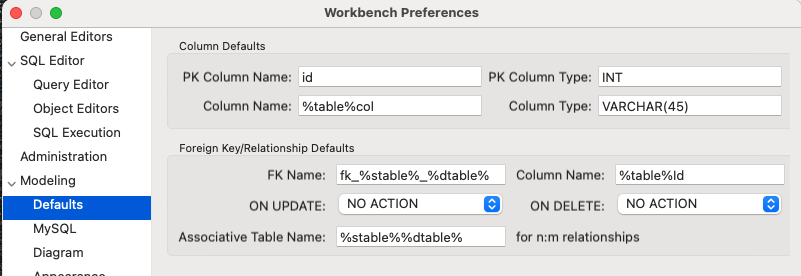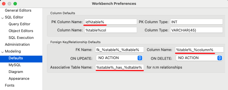 Чтобы постоянно не переименовывать таблицы и поля можно в настройках Workbench задать шаблоны