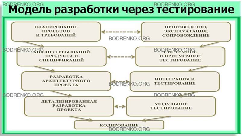 Приближенная по своей сути к практикам PRINCE2, V-модель разработки через тестирование была разработана еще в конце 1980-х годов ведомствами Германии и США, и до сих пор является стандартом немецких правительственных и оборонных проектов. Основной ее принцип состоит в постепенном возрастании степени детализации проекта с течением времени и одновременном проведении «горизонтальных» итераций. Таким образом, результаты каждой из фаз левой стороны буквы V влияют на тестирование и компоновку проекта с правой стороны буквы V: приемо-сдаточные испытания основываются на проведенном анализе требований, интеграционное тестирование – на высокоуровневом описании архитектуры, модульное тестирование – на архитектуре, интерфейсах, алгоритмах и прочих элементах детализированных требованиях к системе.