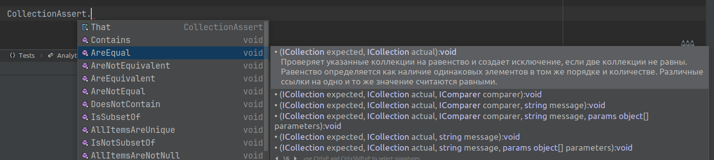 При сравнении скалярных данных (числа, строки...) используется класс Assert. Но так как у нас не скалярный тип данных (List), то нужно использовать соответствующий класс - нам подходит CollectionAssert