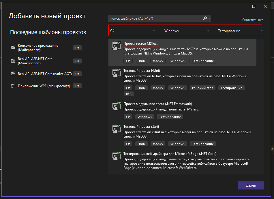 • Тип тестов: MSTest