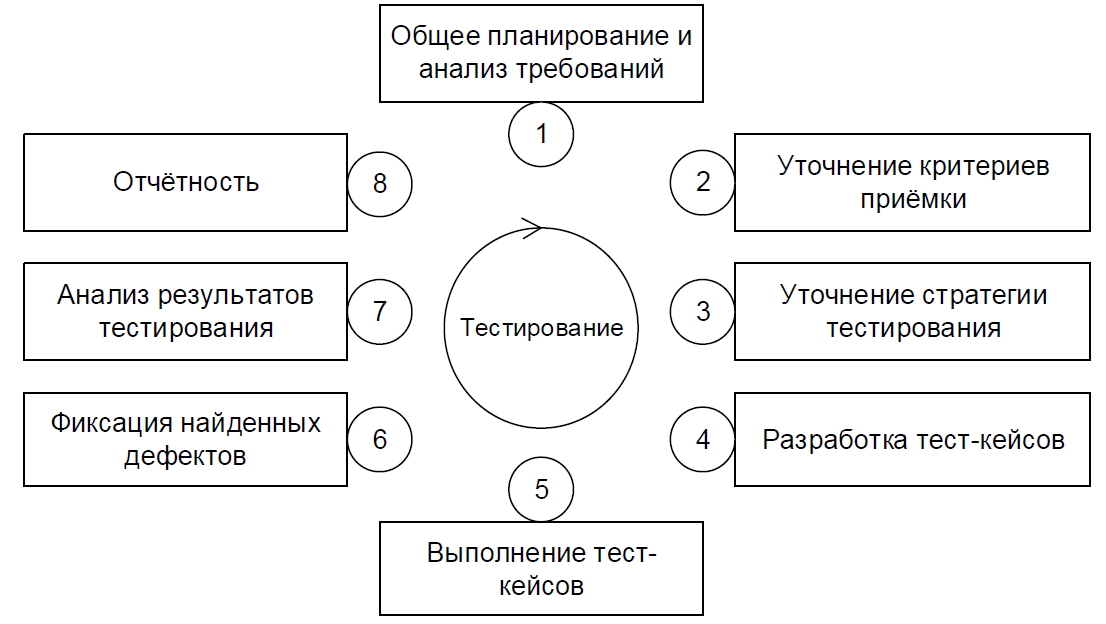 Следуя общей логике итеративности, превалирующей во всех современных моделях разработки ПО, жизненный цикл тестирования также выражается замкнутой последовательностью действий.