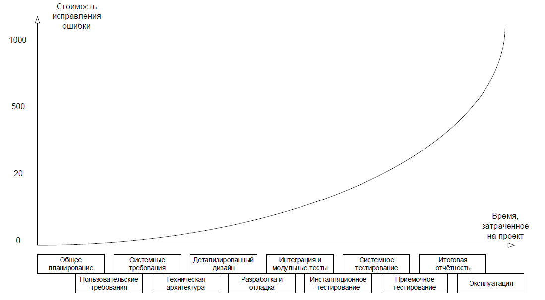 Если проблема в требованиях будет выяснена на этой стадии, её решение может свестись к исправлению пары слов в тексте, в то время как недоработка, вызванная пропущенной проблемой в требованиях и обнаруженная на стадии эксплуатации, может даже полностью уничтожить проект.