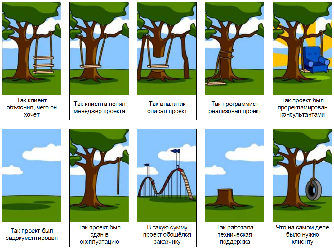 Ещё одним аргументом в пользу тестирования требований является то, что, по разным оценкам, в них зарождается от ½ до ¾ всех проблем с программным обеспечением. В итоге есть риск, что получится так, как показано на рисунке.