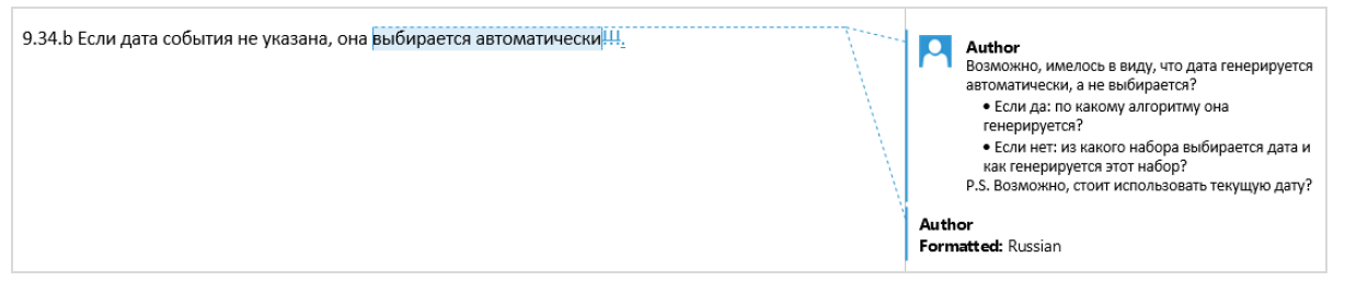 Написание вопросов и комментариев без указания места требования, к которым они относятся. Если ваше инструментальное средство позволяет указать часть требования, к которому вы пишете вопрос или комментарий, сделайте это (например, Word позволяет выделить для комментирования любую часть текста — хоть один символ). Если это невозможно, цитируйте соответствующую часть текста. В противном случае вы порождаете неоднозначность или вовсе делаете вашу пометку бессмысленной, т.к. становится невозможно понять, о чём вообще идёт речь.