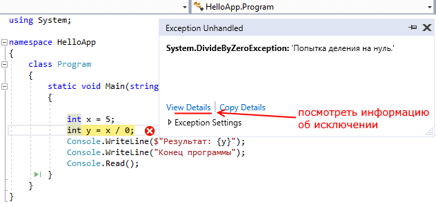 В этом окошке мы видим, что возникло исключение, которое представляет тип System.DivideByZeroException, то есть попытка деления на ноль. С помощью пункта View Details можно посмотреть более детальную информацию об исключении.