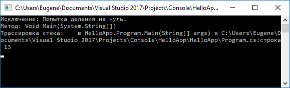 В данном случае происходит деление числа на 0, что приведет к генерации исключения. И при запуске приложения в режиме отладки мы увидим в Visual Studio окошко, которое информирует об исключении: