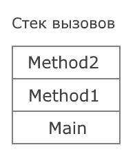В данном случае стек вызовов выглядит следующим образом: метод Main вызывает метод Method1, который, в свою очередь, вызывает метод Method2. И в методе Method2 генерируется исключение DivideByZeroException. Визуально стек вызовов можно представить следующим образом: