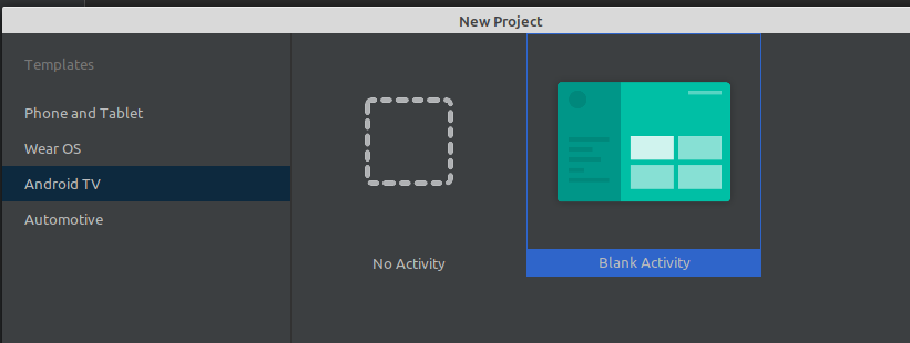 Запустив Android Studio, необходимо создать новый проект. При создании выбрать платформу TV и указать минимальную версию SDK. Android Studio предложит нам создать "Blank Activity", его и создадим (в оригинальной статье предлагают создать пустой проект без активности "No Activity" и руками добавлять классы, файлы разметки и фрагменты, но это долго, проще выкинуть лишнее из рабочего проекта)