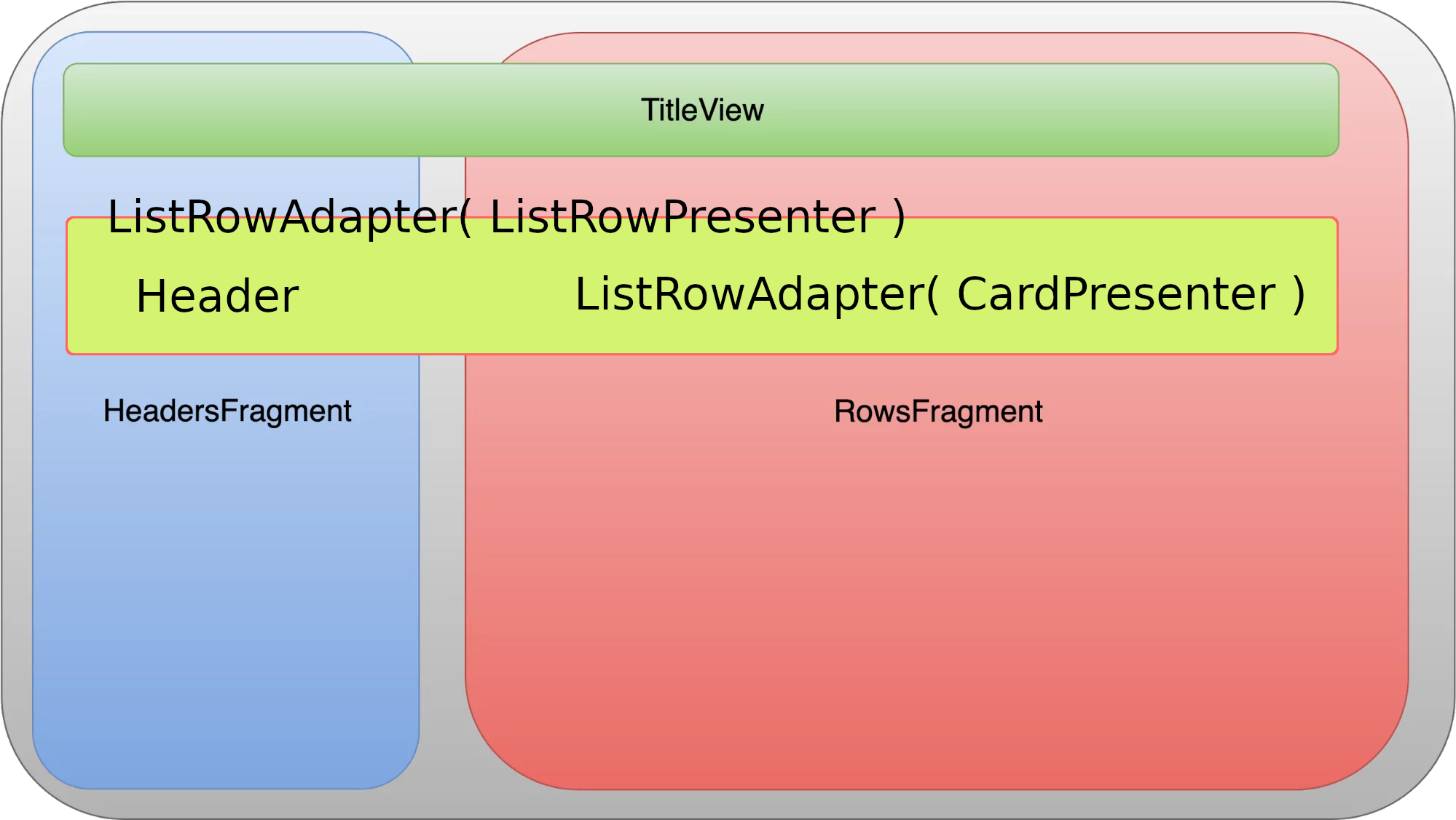HeadersFragment & RowsFragment - HeadersFragment — список заголовков в левой части экрана и RowsFragment — контейнер для контента в правой части экрана. Эти фрагменты работают в связке, и BrowseFragment делегирует им отрисовку элементов своего адаптера.