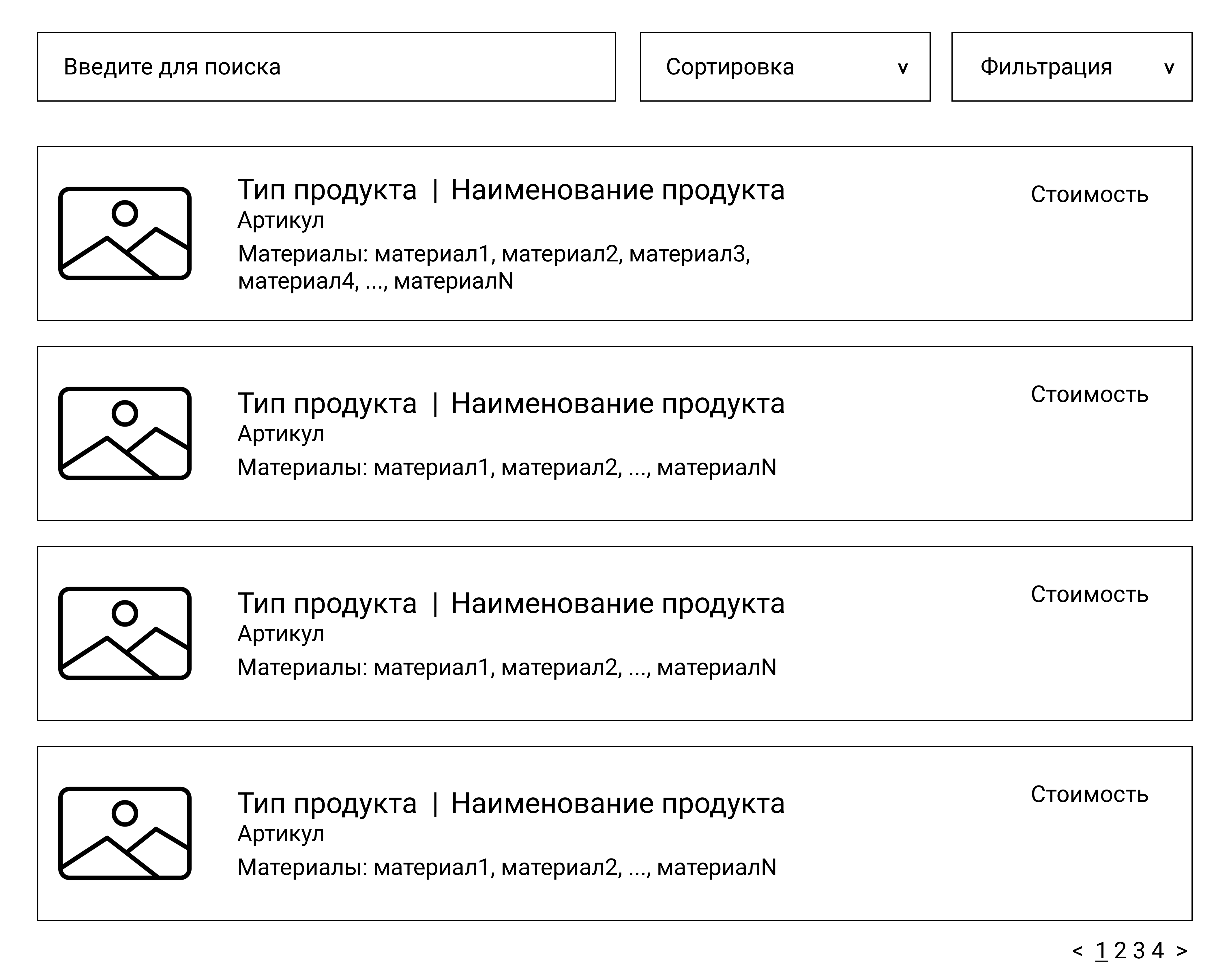 Поиск должен осуществляться по наименованию и описанию продукта. Поиск, сортировка и фильтрация должны происходить в реальном времени, без необходимости нажатия кнопки “найти”/”отфильтровать” и т.п. Фильтрация и поиск должны применяться совместно. Параметры сортировки, выбранные ранее пользователем, должны сохраняться и во время фильтрации с поиском.