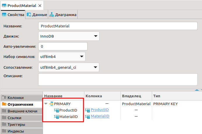 Материалы продукта (в принципе это очевидно по названию) хранятся в таблице ProductMaterial. Это, так называемая, таблица связей - реализация отношения многие (продукты) - ко - многим (материалам). При чтении надо учитывать, что нам нужны материалы только редактируемого продукта, т.е. указать фильтр по редактируемому продукту при выборке: