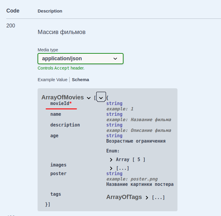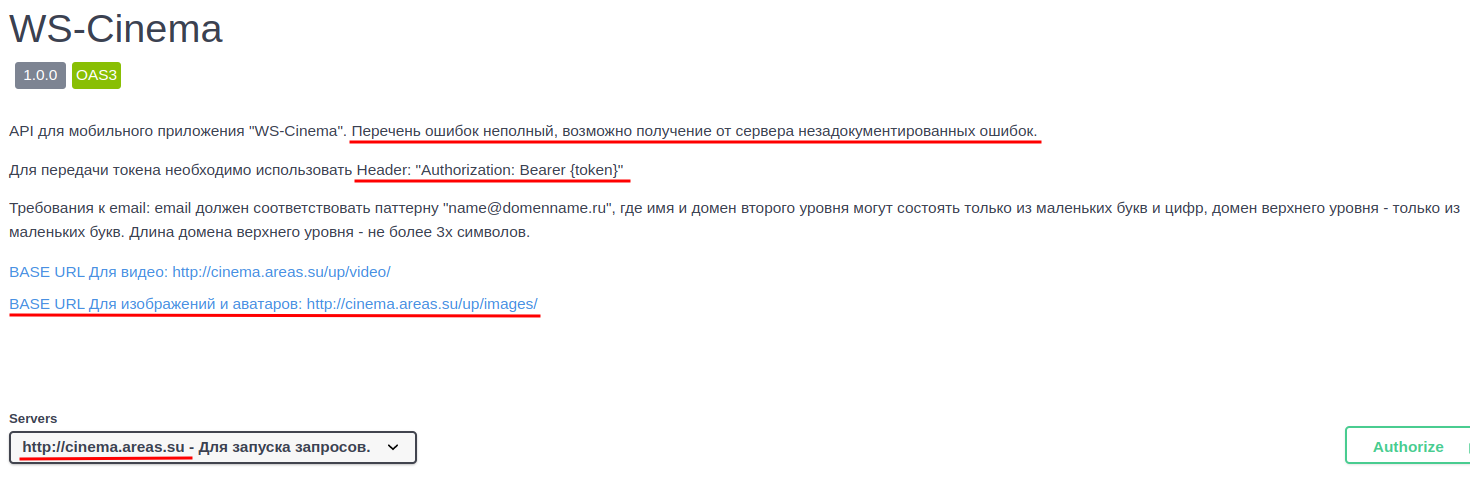 В начале идёт общая информация. Нам тут пока интереснен только так называемый базовый URL. Здесь он находится в блоке Servers (https://cinema.kolei.ru), но может быть написан и просто текстом (как базовые урлы для картинок и видео).