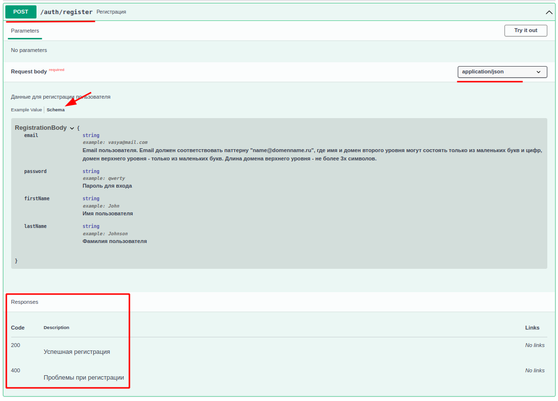 Дальше идут описания методов АПИ. Рассмотрим подробно метод Регистрация: