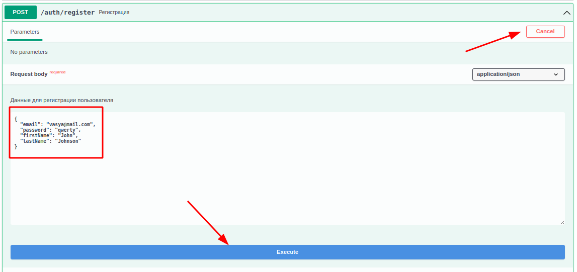 В заголовке указано какой метод и "путь" используются для запроса. К пути надо добавить "базовый урл" и получим полный адрес запроса: https://cinema.kolei.ru/auth/register