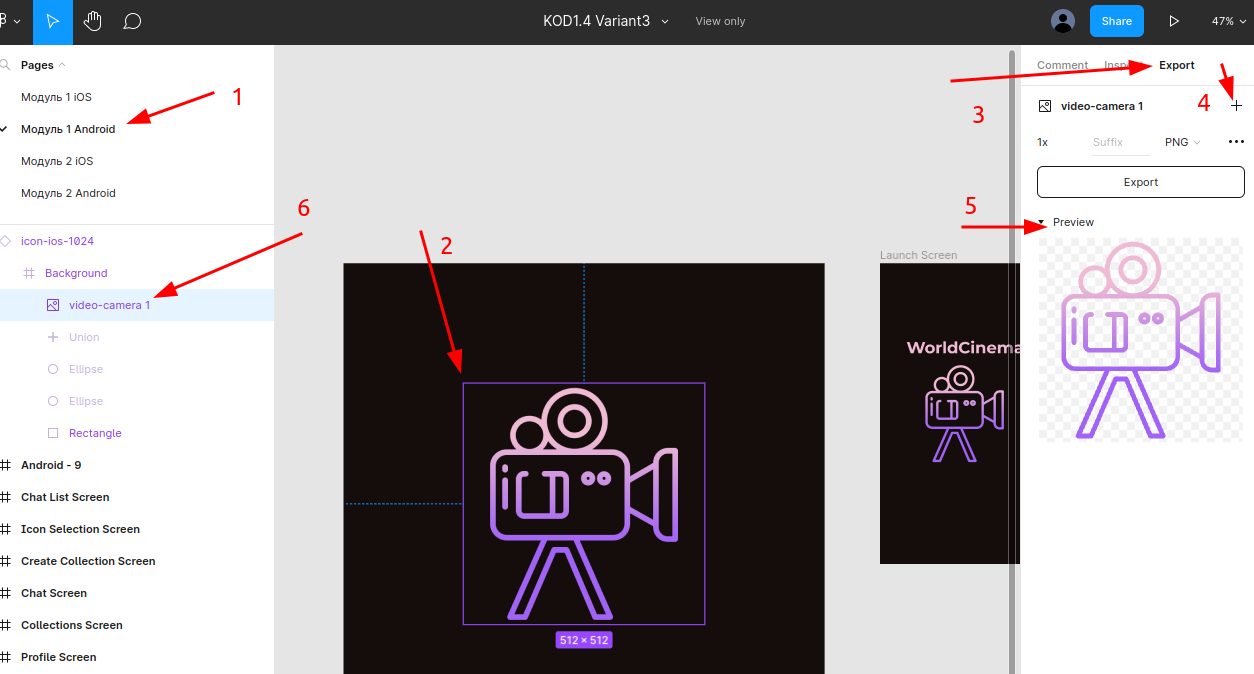 +, чтобы открыть настройки экспортаБраузер сохранит файл с тем же названием, что и у элемента вёрстки, например Icon-android 512.png). Переименуйте его, убрав пробелы, чёрточки и любую другую фигню, которая может помешать воспринимать ресурс по имени (оставьте только латинские буквы и цифры). Ещё, как выяснилось на практике, ресурсы не могут быть в CamelCase, при именовании не используйте большие буквы.