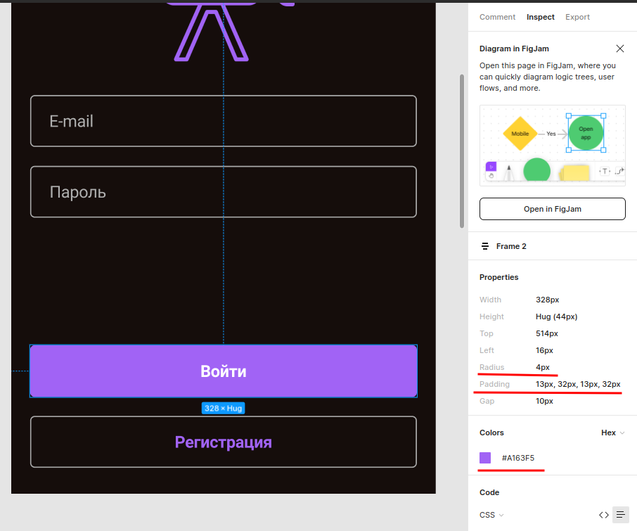 В панели свойств (правая панель) фигмы указаны параметры вёрстки выбранного элемента. В частности там указаны цвет элемента (нужен для кнопки), внутренние отступы (padding) и радиус границы.