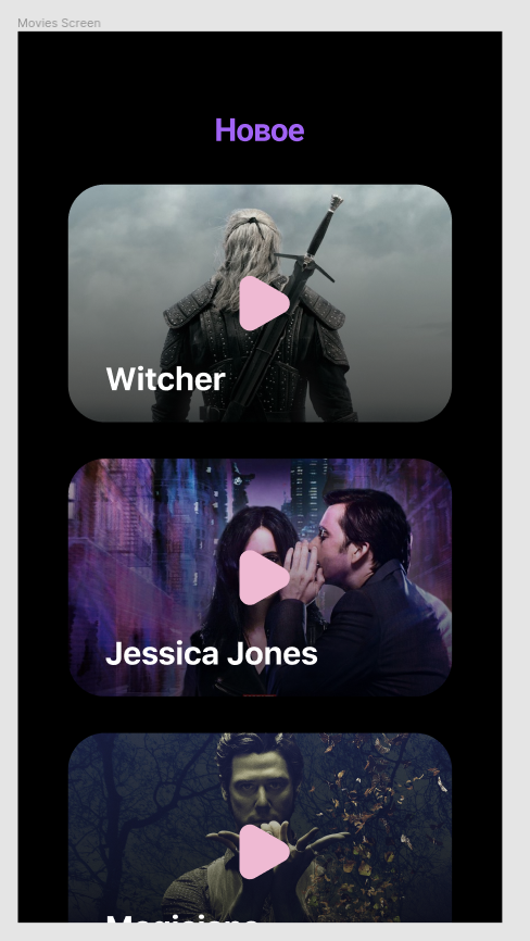 Ячейка фильма соответствует макету. Присутствуют 3 элемента: изображение, название, кнопка (минус 0,1 за каждый отсутствующий или некорректный элемент) | 0.3 Список фильмов прокручивается по вертикали | 0.2 Итого | 1
