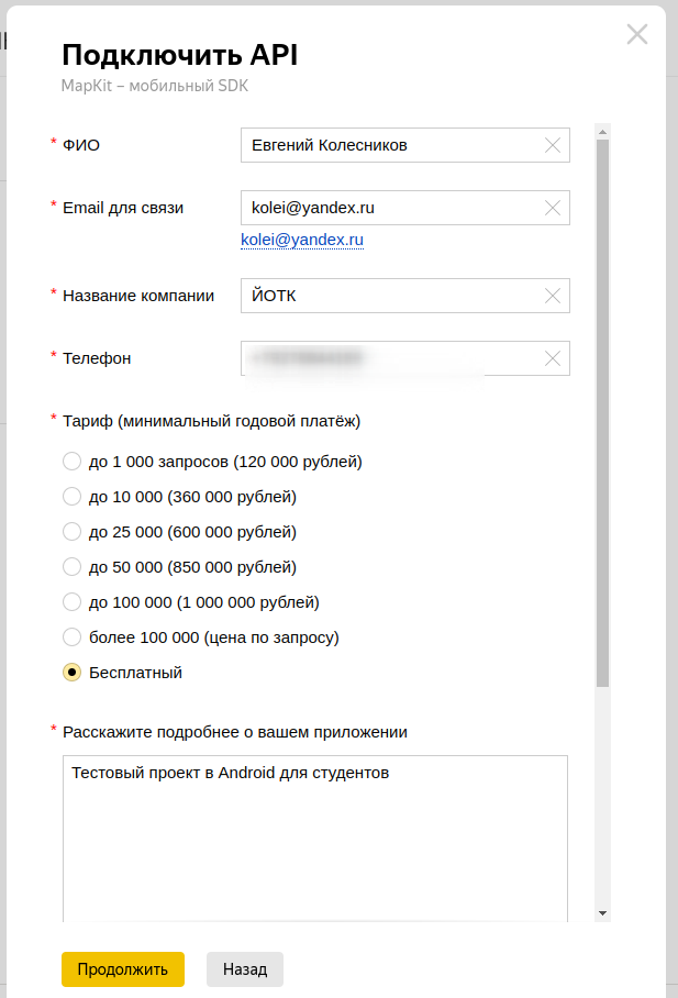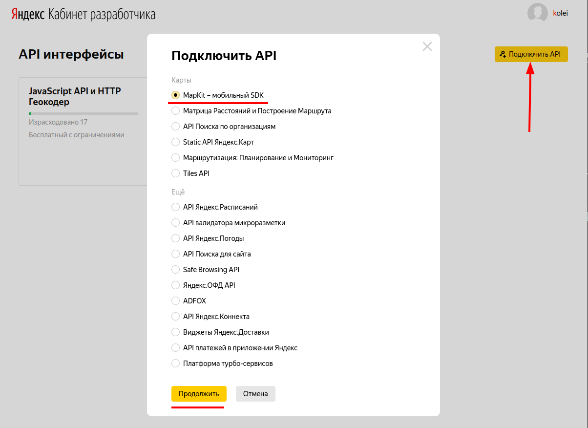 Нажмите "Подключить API" и выберите пакет "MapKit - мобильный SDK".