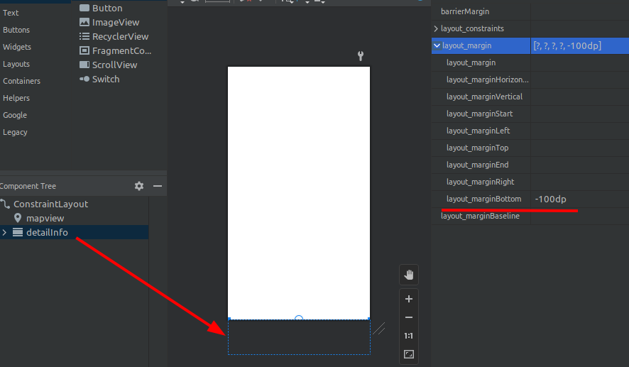 android:layout_marginBottom="-432dp"Используя способ анимации свойств объекта сделаем, чтобы наше окно с детальной информацией всплывало при клике на маркер и скрывалось при клике на карту: