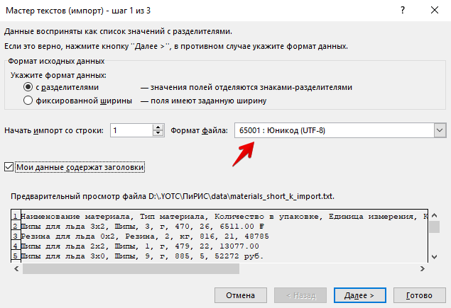 Файл материалов у нас в формате TXT. Такой формат напрямую из Excel открыть нельзя - загружайте через импорт данных (в разных версиях Excel меню может называться по-разному)