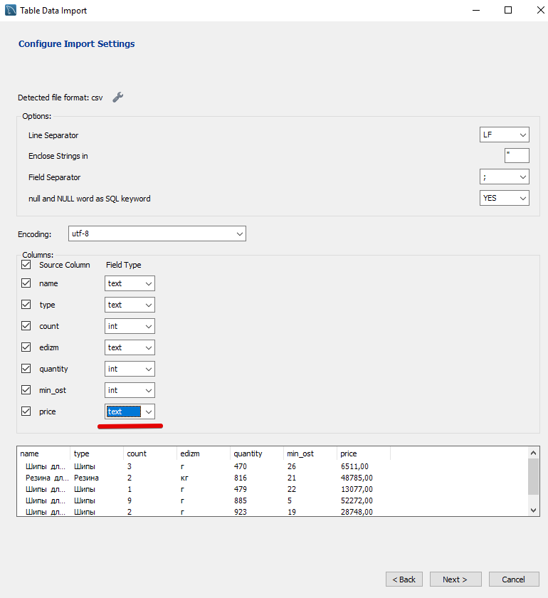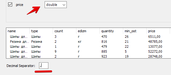 Смотрим, всё ли правильно определилось. Судя по тому, что цену как число не распознало MySQL по-умолчанию ждёт точку в качестве разделителя.