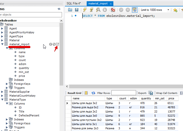 теперь аналогично из контекстного меню таблицы material_import выбираем "Send to SQL Editor" -> "Select All Statement"